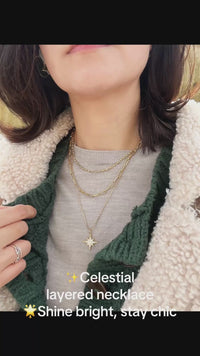 Add a touch of sophistication with our gold multi-layered necklace, featuring fine bead, paperclip, and snake chains accented with delicate a sunburst charm. A perfect blend of elegance and modern style — effortlessly elevate any outfit.